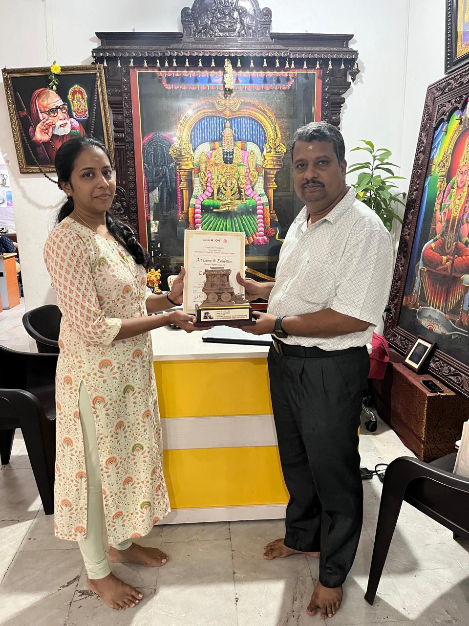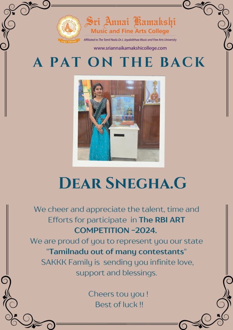 I am Snegha G and I am a 3rd year BFA Painting student at Sri Annai Kamakshi Music and Fine Arts College. This college has helped me to participate in many competitions, especially the competition conducted by RBI, which is 90 year old art competition. I participated in the competition and was selected to represent Tamilnadu and I had the opportunity to fly along and visit Delhi for the first time. I had got a chance to visit the RBI office in Delhi and learn more about the RBI. I had participated in 40 competitions in Chennai and won many prizes in colleges like MCC WCC, Vaishnav college and many more.
