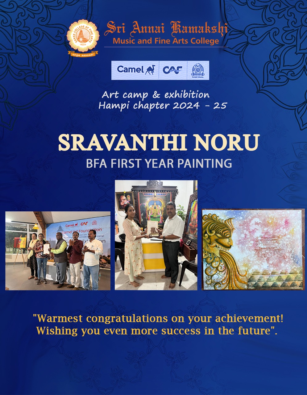 I was pleased to represent our college at the Camlin Workshop held in Hampi on 25 November 2024. The workshop was held on behalf of the Hampi Chapter and lasted for 5 days. On the 1st day, the new product was explained and there was a shared knowledge of how to use the colours and how to mix them. On the 2nd day, the entire team went to the Hampi Heritage Walk. On the 3rd day we got our materials and in the evening there was an icebreaker event where we got together with other artists from different states, which helped us to share our knowledge and learn new techniques from them. On day 4, we had our own time to start painting and the mentors were there to monitor the way we presented our paintings. In the evening of the same day there was a small motivational talk. On the 5th day, the last day of our painting, we had to submit it and we also had a demonstration by Dr Vijay Gopal Sakpal.